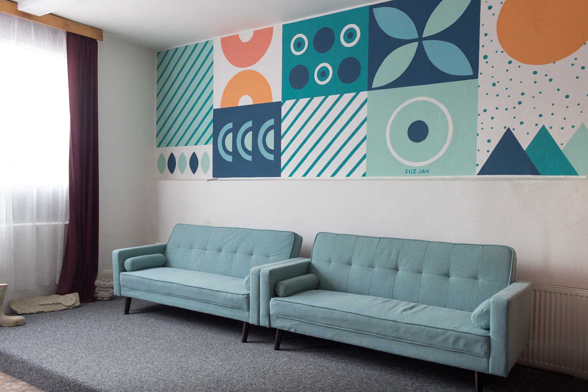 This room is used for meetings and can accommodate up to 60 people. In its back part, I created a modern geometric painting that enlivens and brightens the interior.